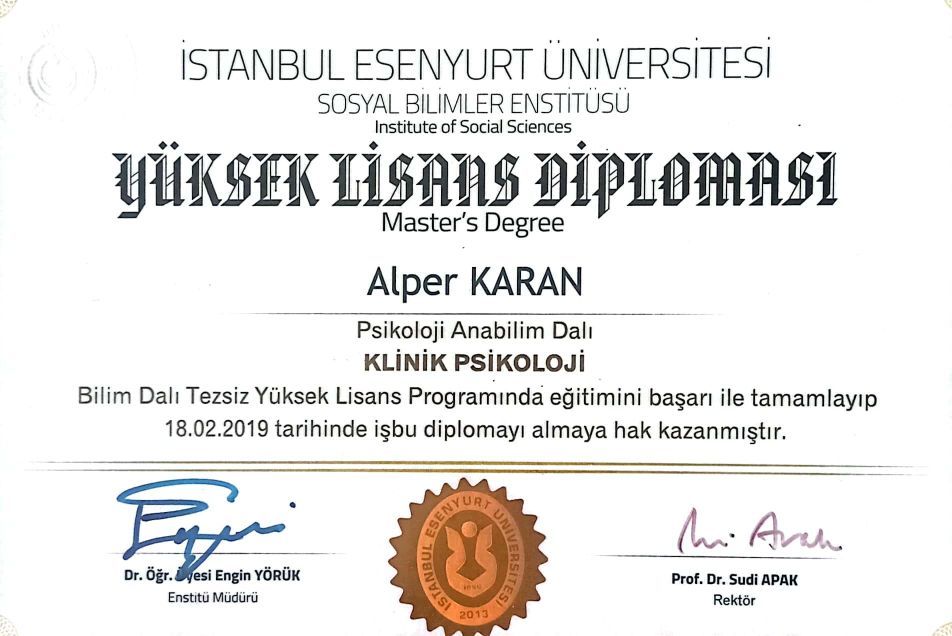 • 2019 yılında İstanbul Esenyurt Üniversitesi’nde Klinik Psikoloji Yüksek Lisans eğitimini tamamladı.