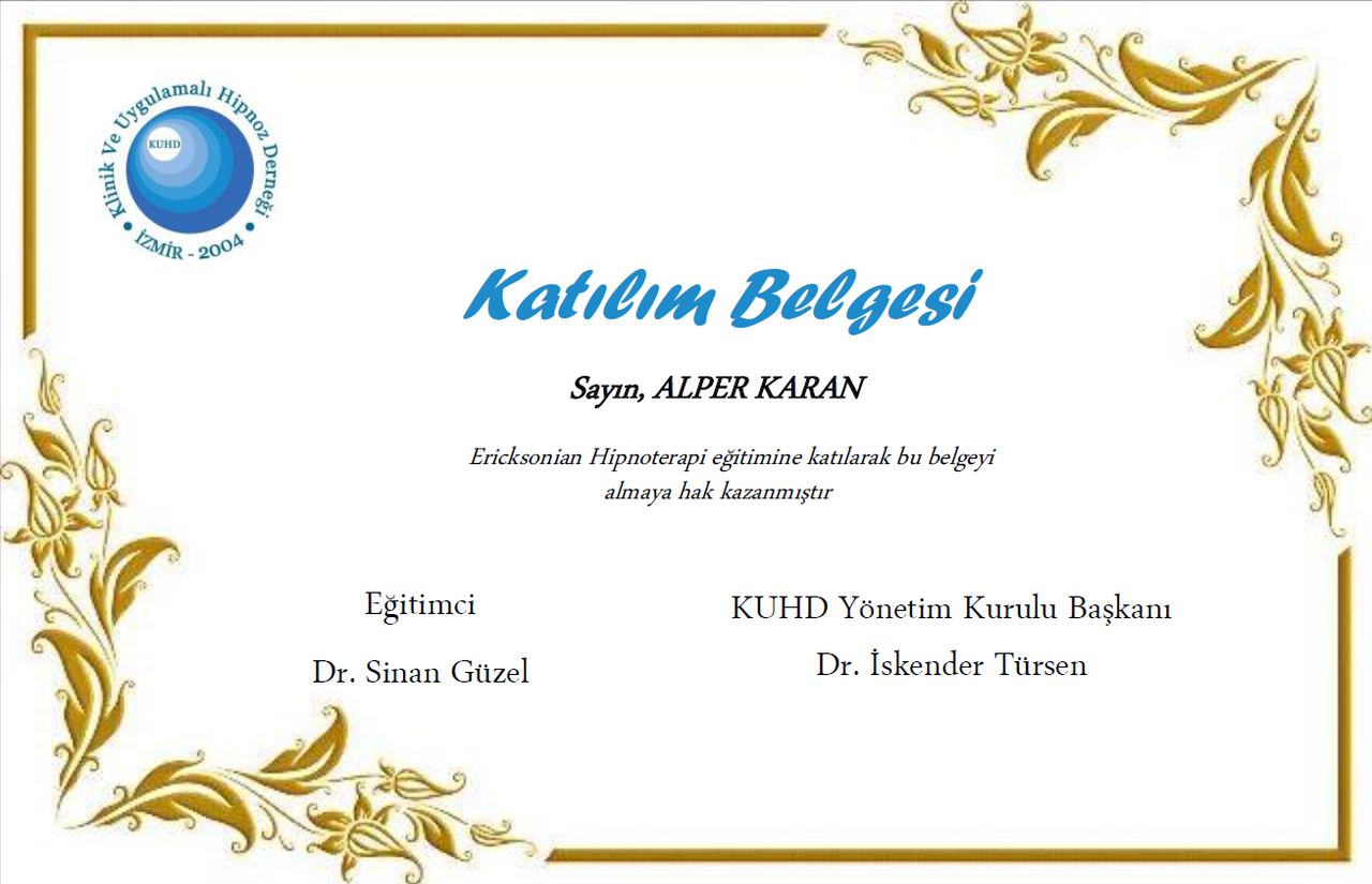 • Klinik ve Uygulamalı Hipnoz Derneği – Ericksonian Hipnoterapi Eğitimi (Dr. Sinan GÜZEL)